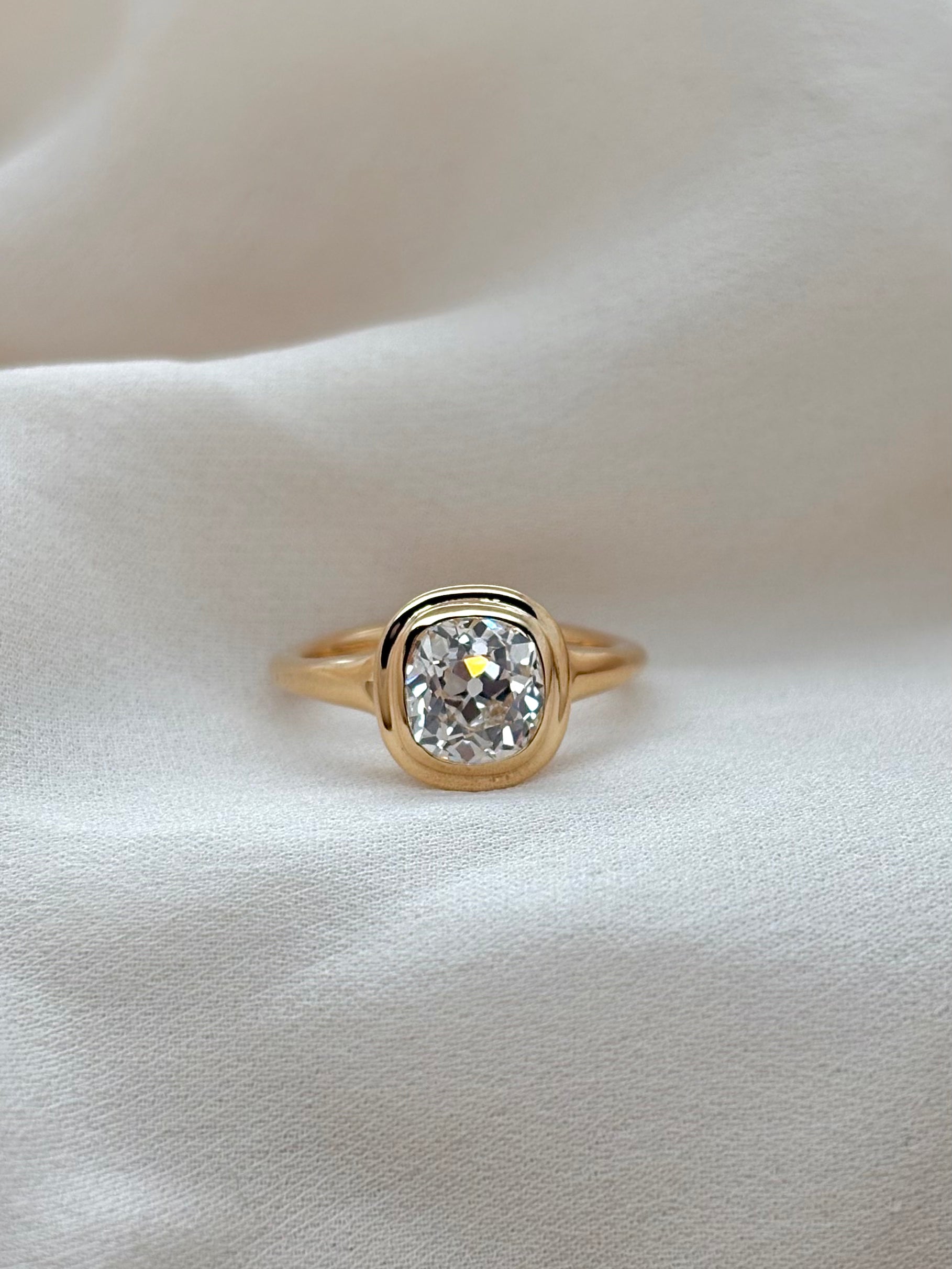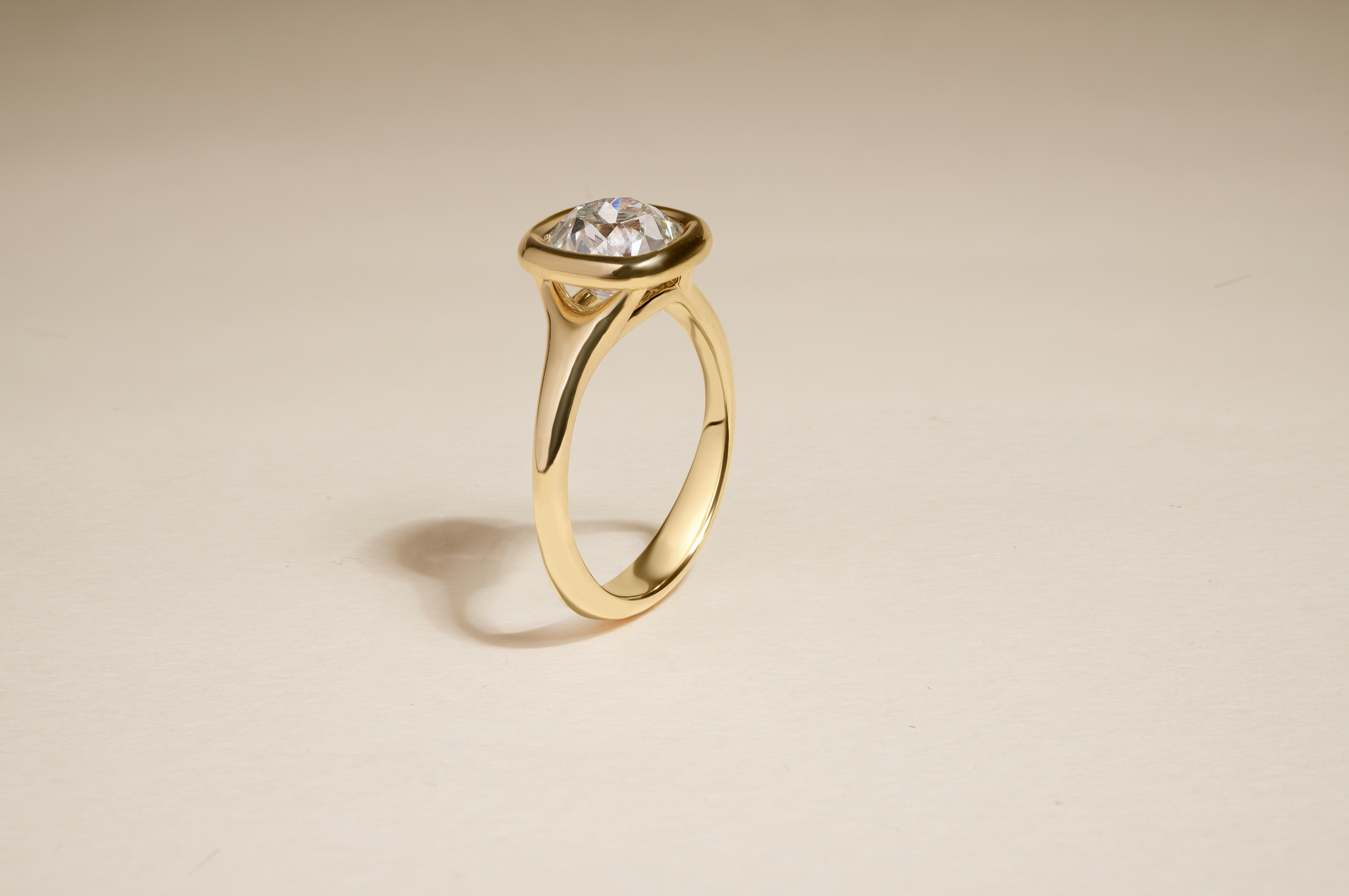In the Seraph, a rounded, gold bezel hoop securely cradles the center stone, accentuating its brilliance and reflecting large pops of color. Below, a curved, tapered band adds fluidity to create a dynamic design.