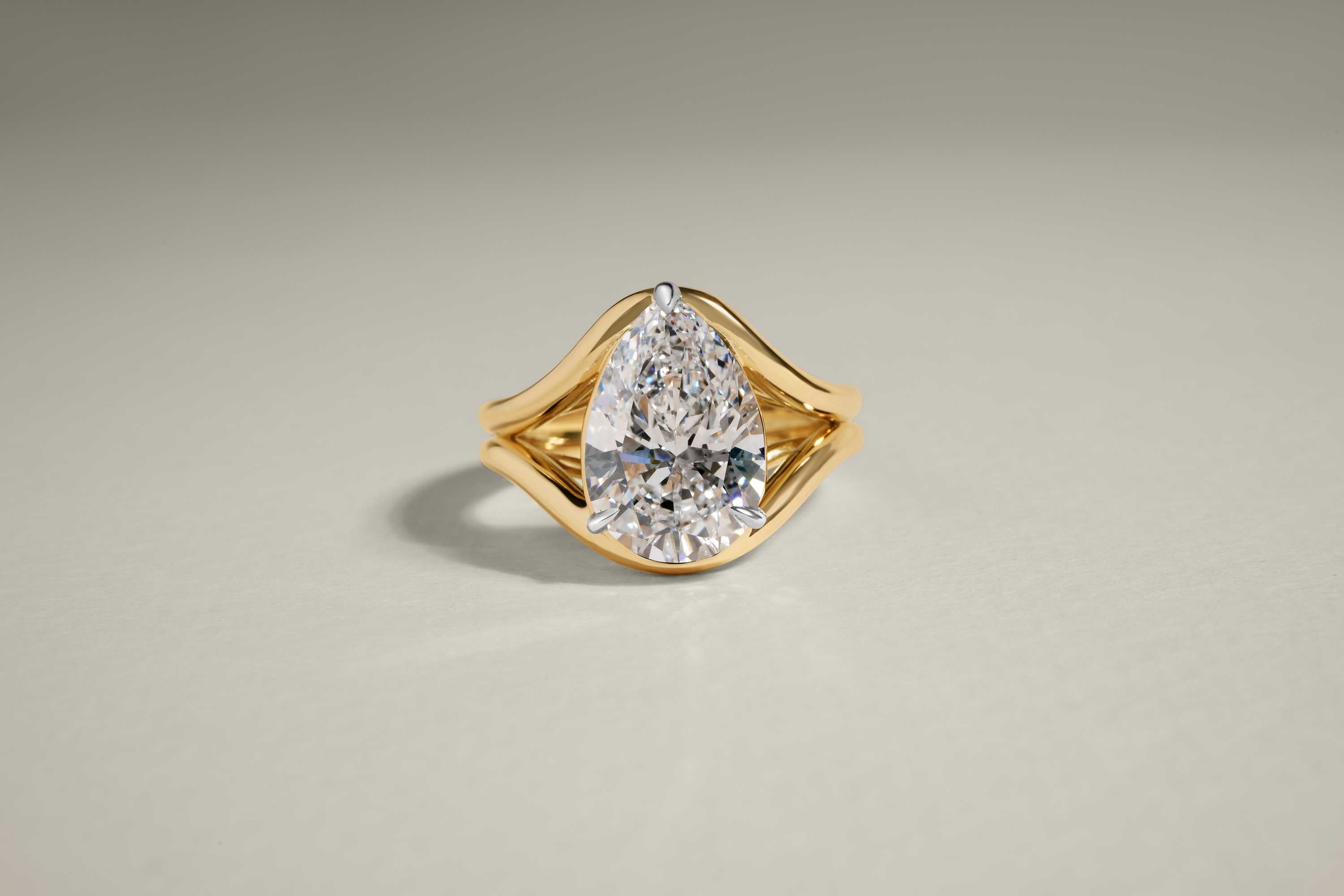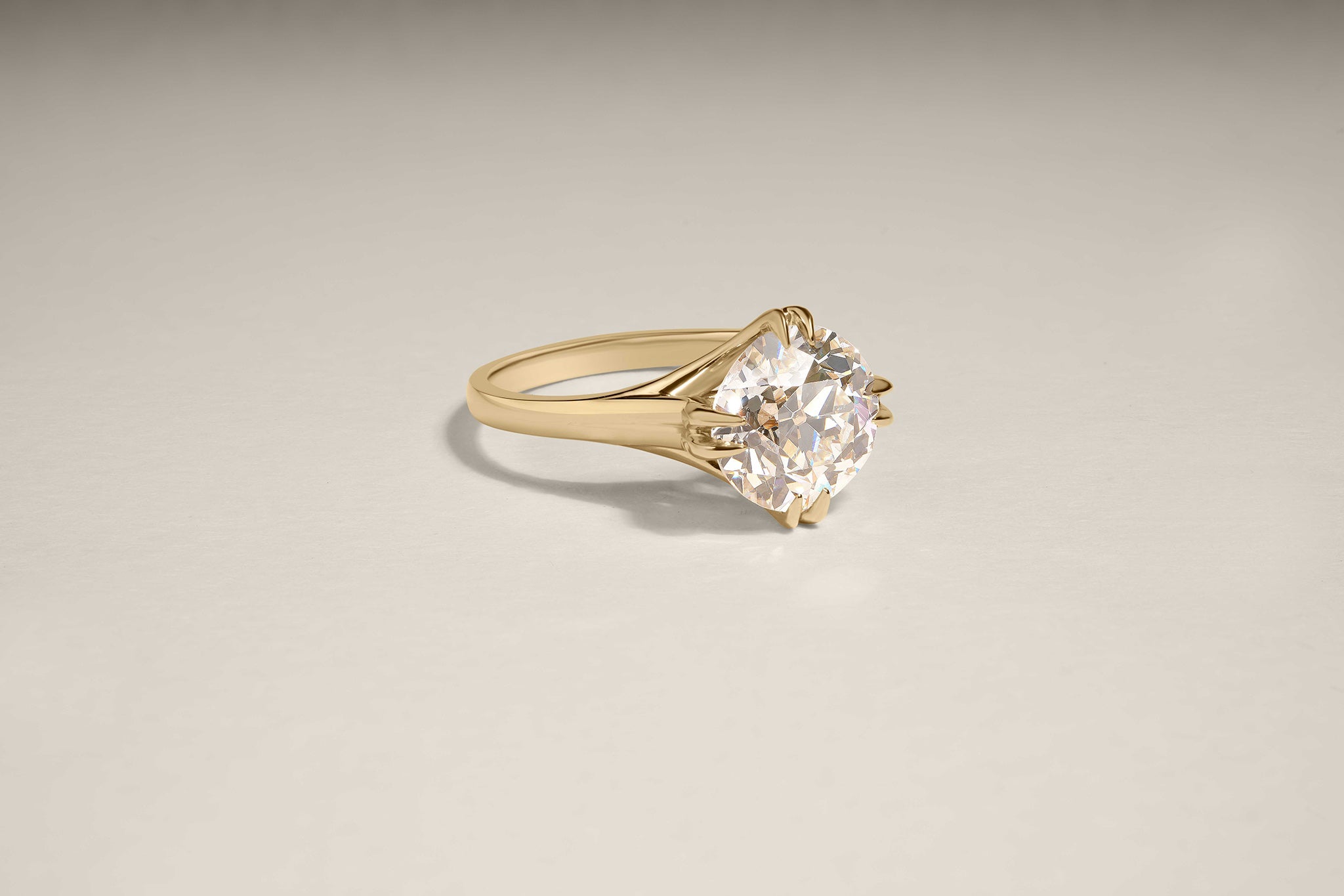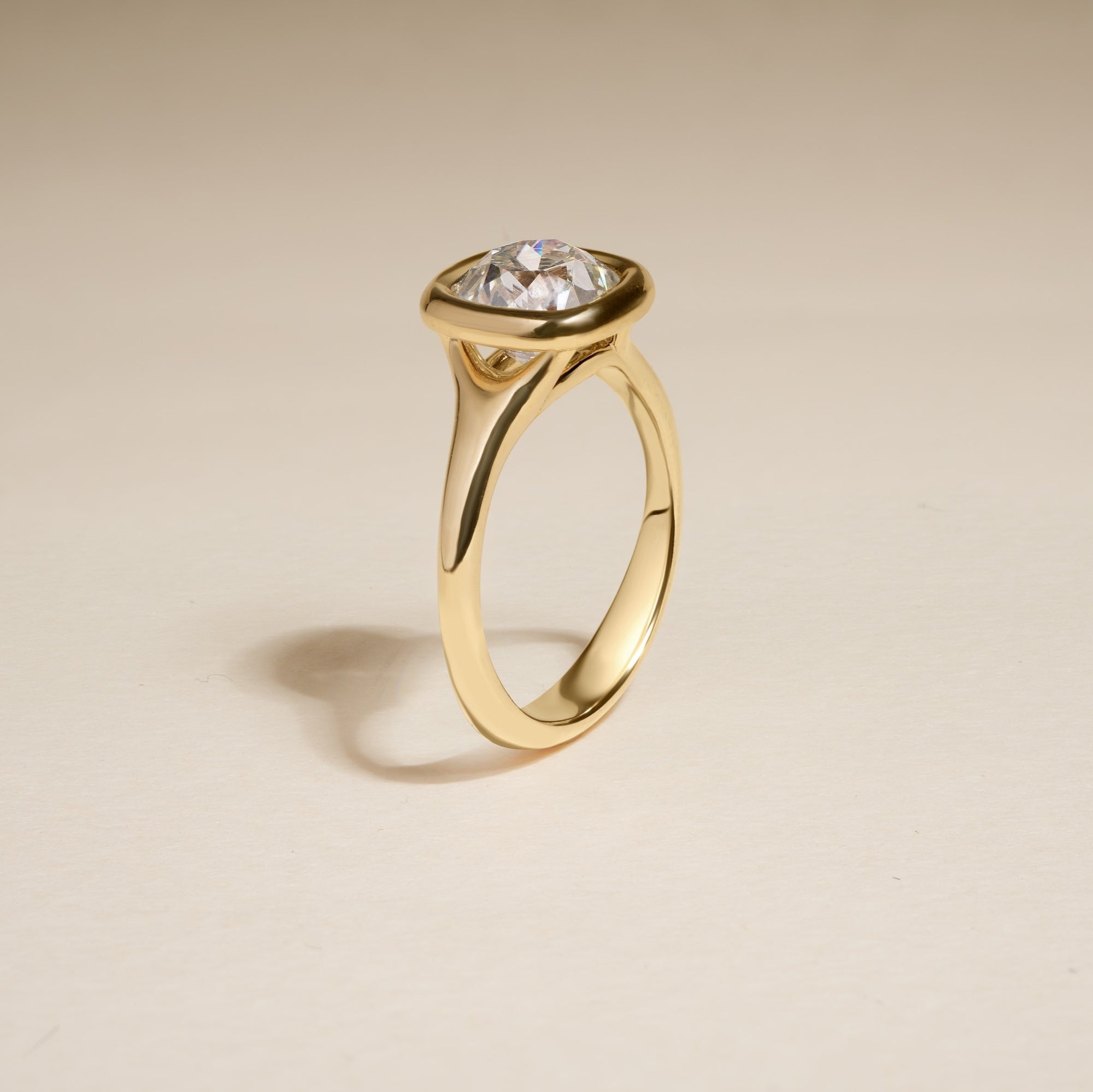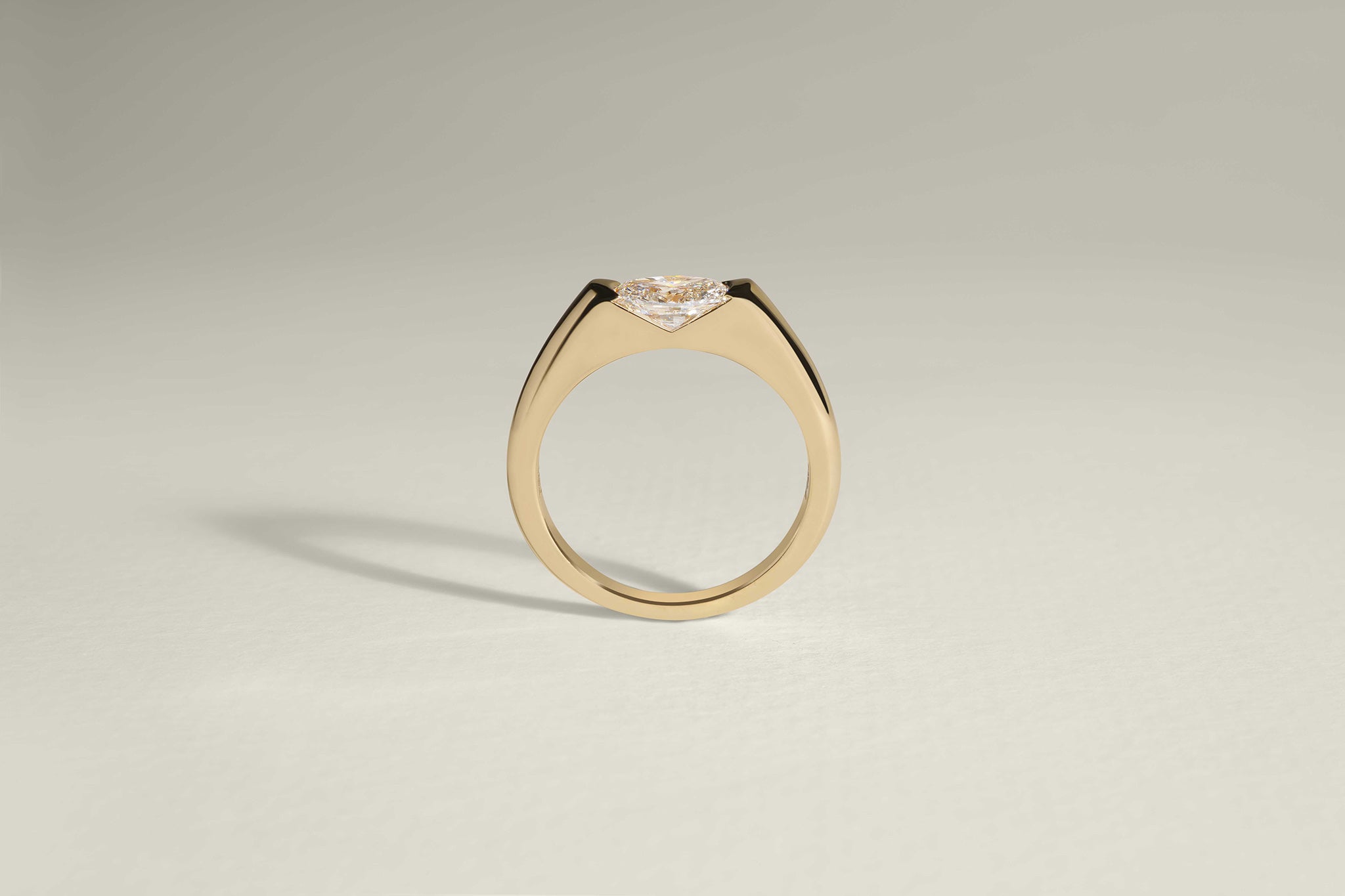 In the Seraph, a substantial rounded gold bezel securely cradles the diamond, accentuating its brilliance and size. Below, a curving wave band adds grace and fluidity to create a dynamic design.
