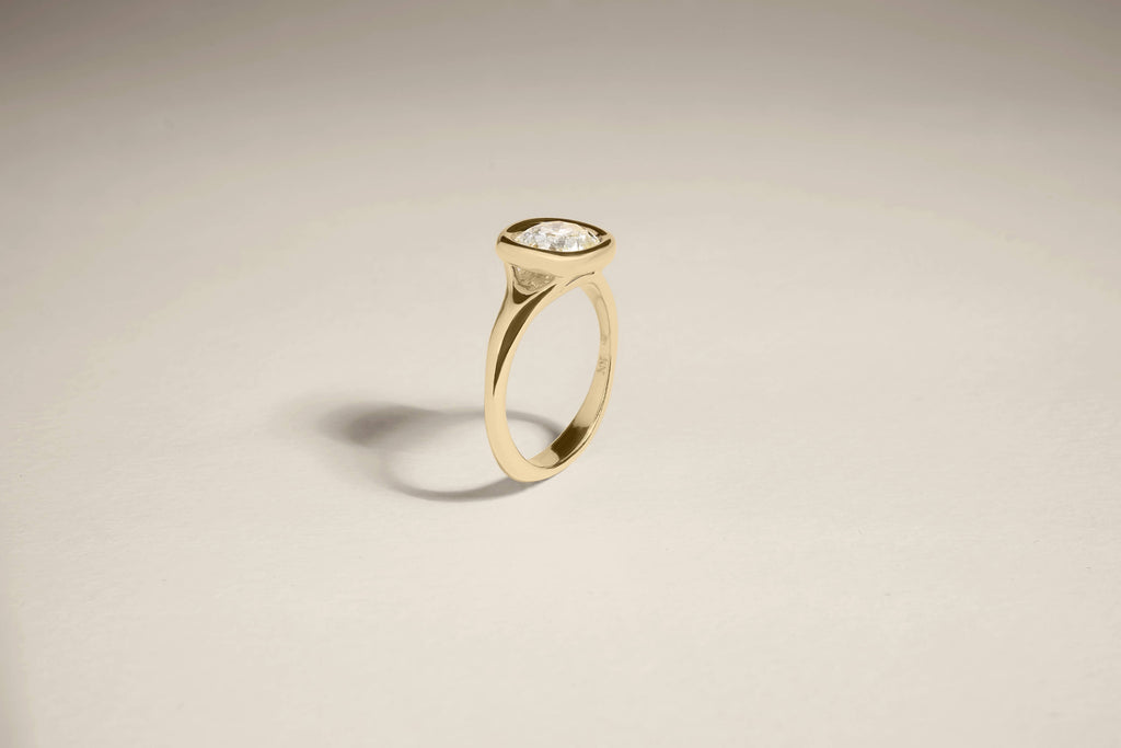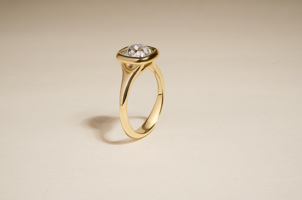 In the Seraph, a rounded, gold bezel hoop securely cradles the center stone, accentuating its brilliance and reflecting large pops of color. Below, a curved, tapered band adds fluidity to create a dynamic design.