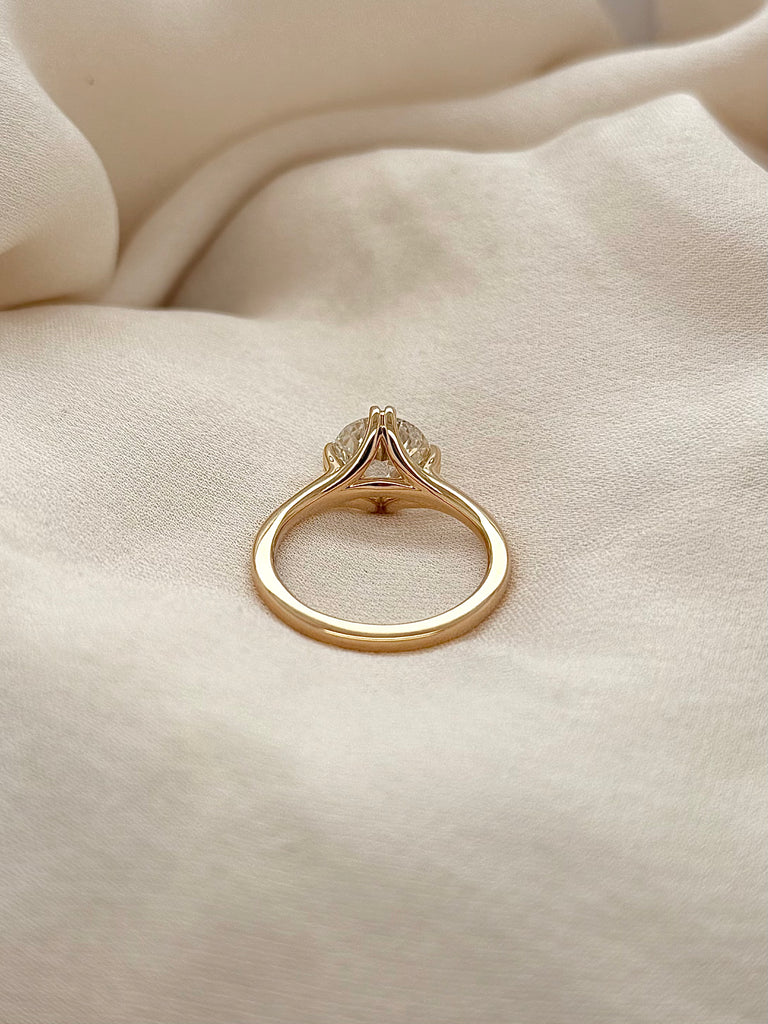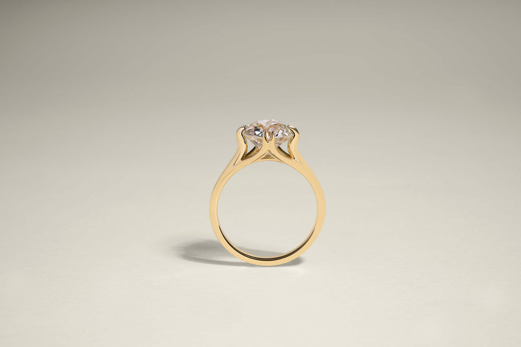 The Unis embodies continuous form and flow with its narrow band tapering out as it approaches the stone, before branding into double prongs at cardinal points.